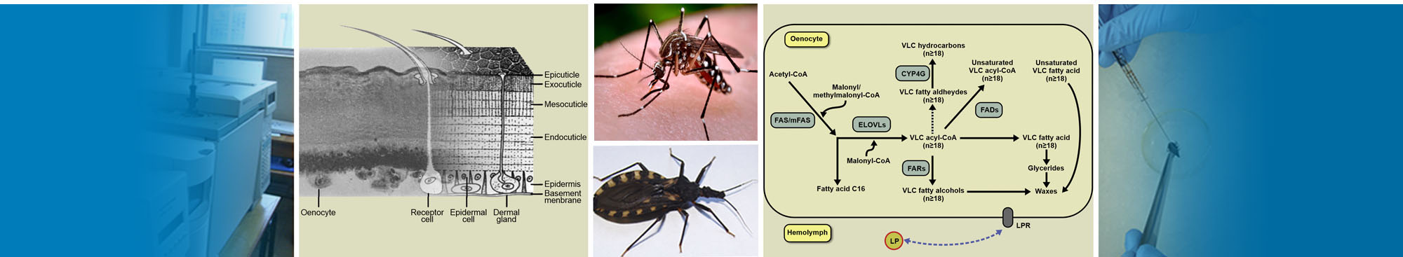 Esta sublínea de trabajo es la más reciente, tiene como objetivo avanzar en el conocimiento de aspectos bioquímicos y moleculares de lípidos cuticulares y compuestos volátiles involucrados en la comunicación química y en la interacción, tanto en insectos como en hongos patógenos de importancia sanitaria y agronómica. Pretende aportar no solo información básica sino también su aplicación futura en el mejoramiento de nuevas herramientas de control de bajo impacto ambiental.