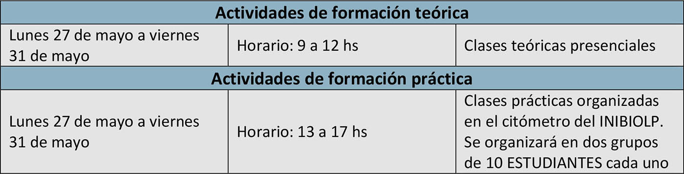 Las prácticas experimentales se realizarán en grupos de 10 estudiantes, por lo tanto, los días lunes, martes y miércoles se trabajará en simultáneo con dos grupos; mientras un grupo hace el experimento el otro grupo analizará resultados de experimentos realizados previamente por los organizadores del curso. Una vez que ambos grupos realicen su propio experimento (anexo I, II y III) analizarán sus propios resultados con un especialista en análisis de datos de la empresa BD, que les dará acceso a licencias de flowjo educativas a los participantes de manera temporaria durante las actividades. Finalizados estos cálculos se discutirán entre todo el grupo los resultados obtenidos y analizarán las distintas formas de interpretar y presentar los resultados de citometría de flujo.